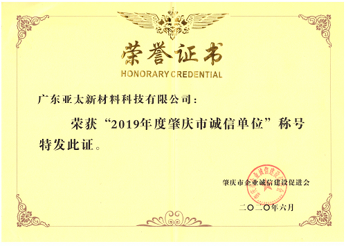 诚信之誉,立足之基 广东亚太公司荣获“2019年度肇庆市诚信单位”称号阅读次数:1086 | 发布日期:2020/6/19 | 作者: | 来源: