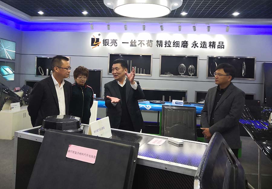 图:朱增余董事长(中间)向李伟忠市长(左一)介绍复合材料汽车零部件新研发成果李伟忠市长参观了产品展示厅、复合材料成型车间、产品试制过程,询问了产品的成型速度、核心技术,产品客户。