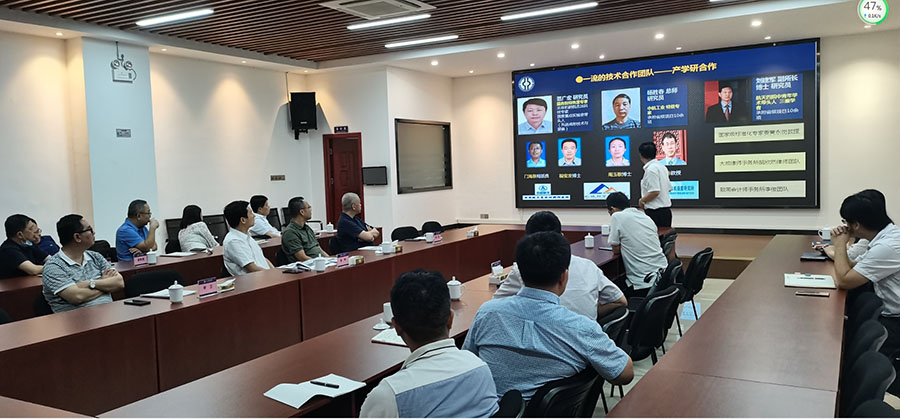 图:(左1)肇庆市国资委党委书记、主任杨坤;(左2)朱增余董事长介绍新研发产品