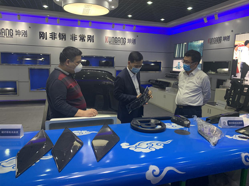 图1:朱增余董事长(右)向陈军忠副市长(中间)介绍广东亚太公司碳纤维复合材料汽车零部件产品